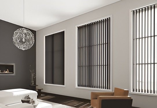 Vertical Blinds provide a highly versatile and functional solution, particularly well-suited for large windows and patio doors. Their unique design, featuring individual louvres that rotate 180^\circ, allows for precise, superior control over natural light direction and glare, which is their main benefit. They offer excellent daytime privacy, as the louvres can be tilted to block external views while still allowing light ingress. Vertical Blinds create a classic, streamlined look that visually elongates a space and are a durable, low-maintenance option. While they are available in blackout fabrics, the mechanical gaps between the louvres and at the headrail mean they do not achieve total room blackout.